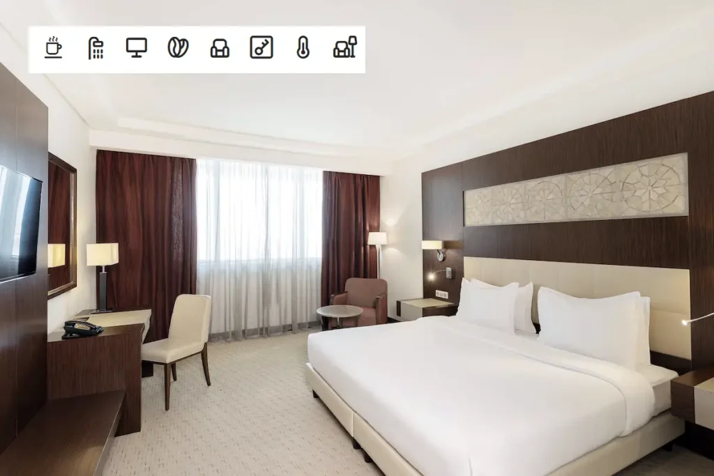 the Radisson Blu Hotel and Conference Centre, is a 5-star business hotel offer Standard Room (about 25 m2) bathroom, Coffee and tea Facilities, flat screen TV, Individual room climate control, in room safe, work desk, mini bar, free Wi-Fi, On-site spa and wellness facility, Fitness Center Outdoor & indoor pool, Safety deposit box