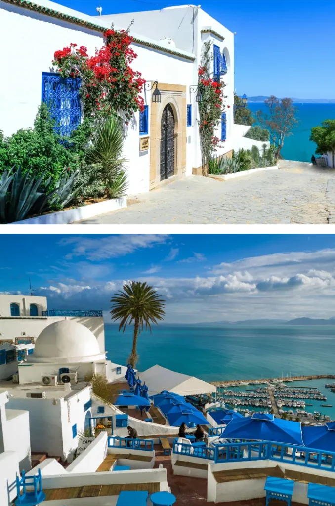 Sidi Bou Said is characterised by authentic Arab-Islamic architecture, celebrating the duality of blue and white, where only these two colours adorn the walls, doors, and windows. The houses, embellished with beautiful ancient inscriptions and decorations, appear as if stacked one upon another, connected by narrow paved alleys and passages. Among Sidi Bou Said’s most famous landmarks is the “Ennejma Ezzahra” Palace (Star of Venus/Morning Star), built by the English Baron Rodolphe d’Erlanger. Its architectural design uniquely combines Arab-Andalusian style with European touches. Today, the palace houses the Centre for Arab and Mediterranean Music, where it displays a rich collection of rare musical instruments and historical documents, and hosts cultural events that reflect Tunisian artistic heritage.With its breathtaking views of the Gulf of Tunis, the palace and Sidi Bou Said in general constitute an unforgettable destination for art and beauty enthusiasts, where history meets natural charm in its most splendid form.